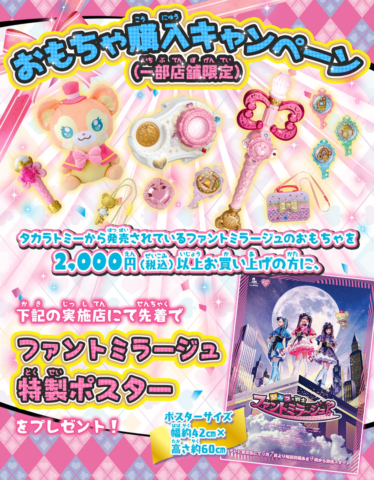 2,000円(税込)以上お買い上げの方に、下記店舗の玩具売場にて先着で【ファントミラージュ特製ポスター】を差し上げます!■キャンペーン期間 及び 実施店舗
