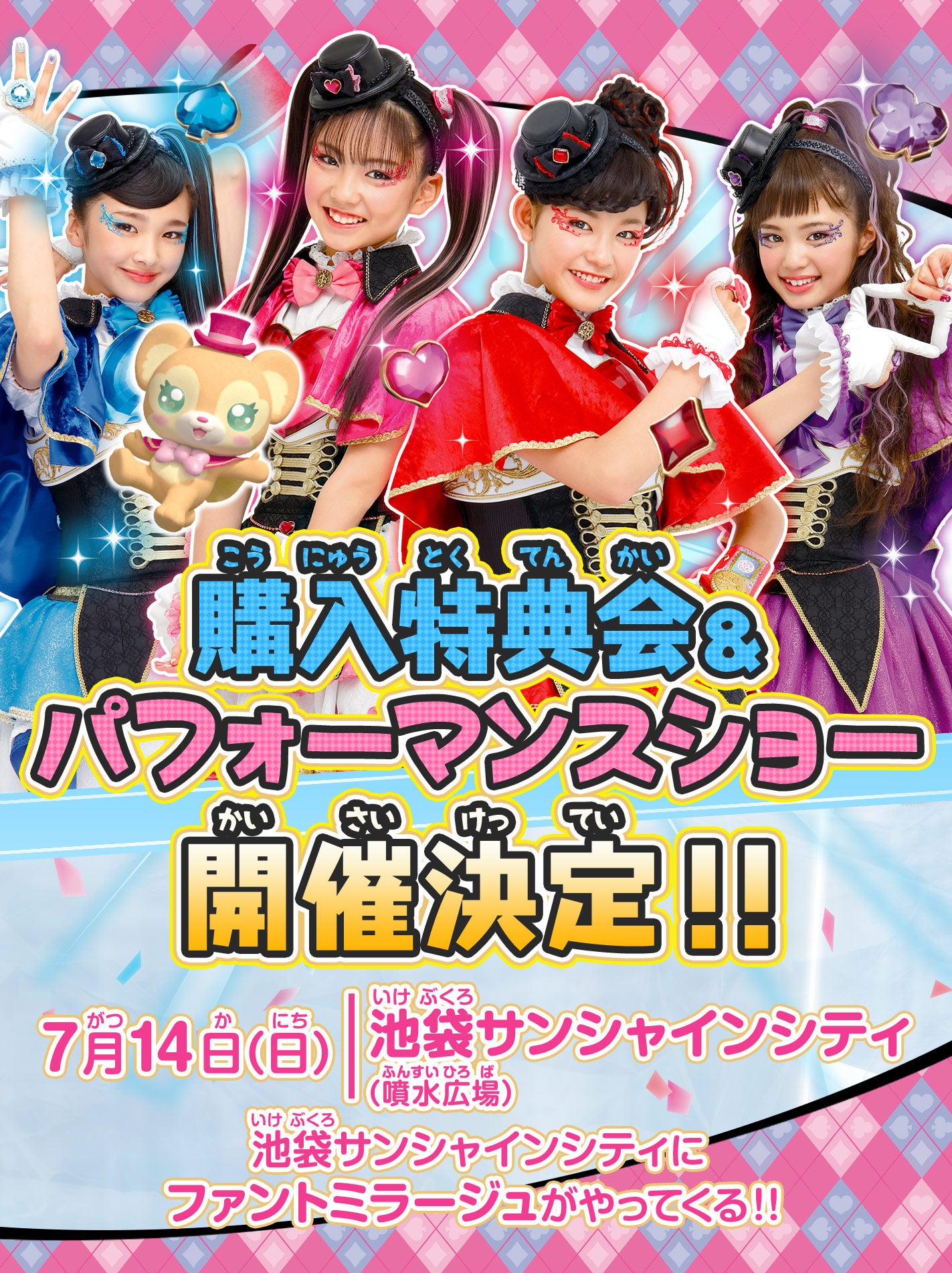 7月14日当日、トイザらス・ベビーザらス池袋サンシャインシティ店またはキデイランド池袋サンシャインシティ店にてタカラトミーから発売されているファントミラージュの商品を3,000円(税込)以上お買い上げの方に『直筆サイン入りポスター引換券』を先着で合計600名様にお渡しいたします。【パフォーマンスショーについて】
