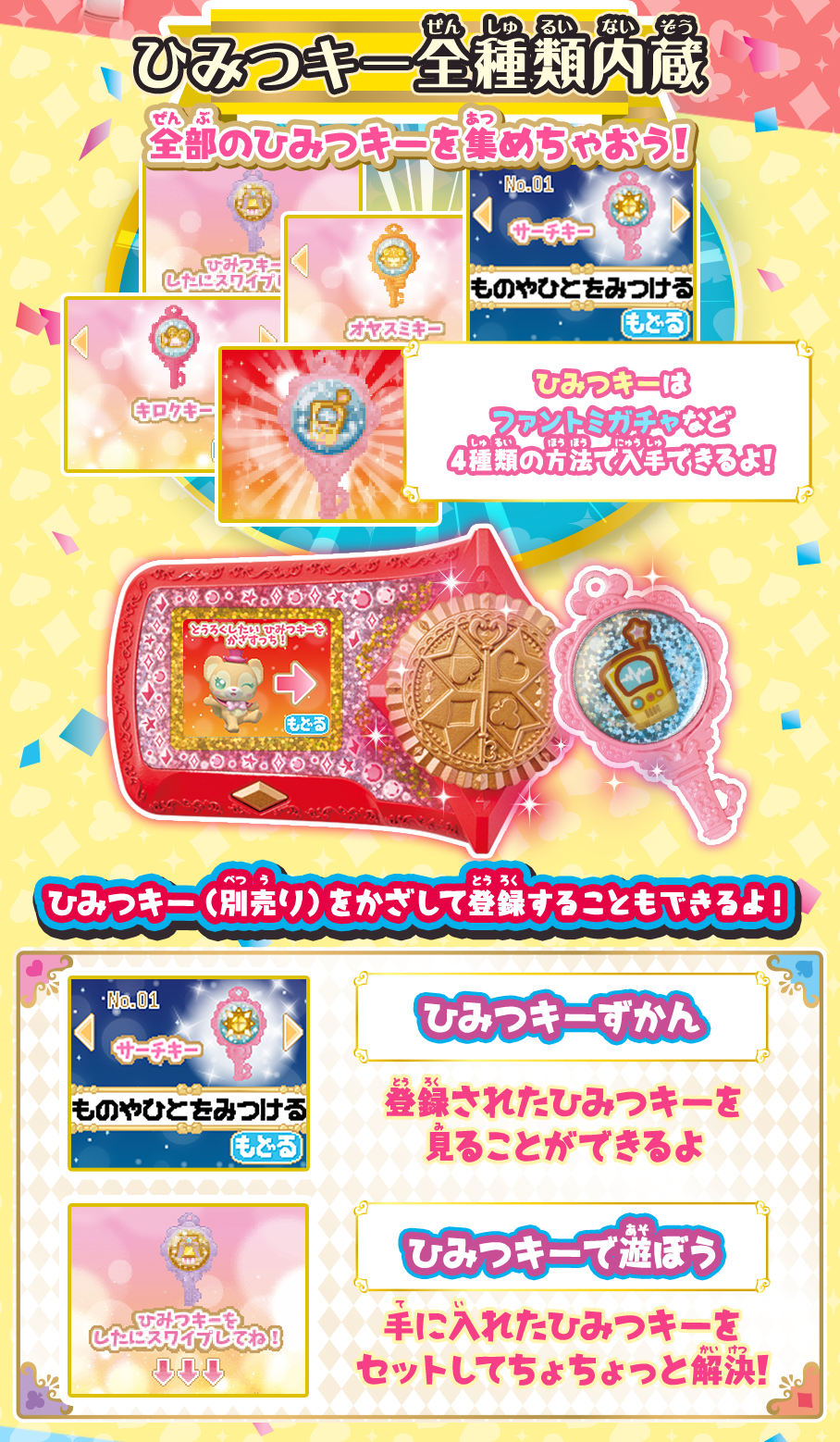 また、全種類のひみつキーが内蔵されており、それぞれのひみつキーを使ってのひみつキー遊びや図鑑を見ることができます。