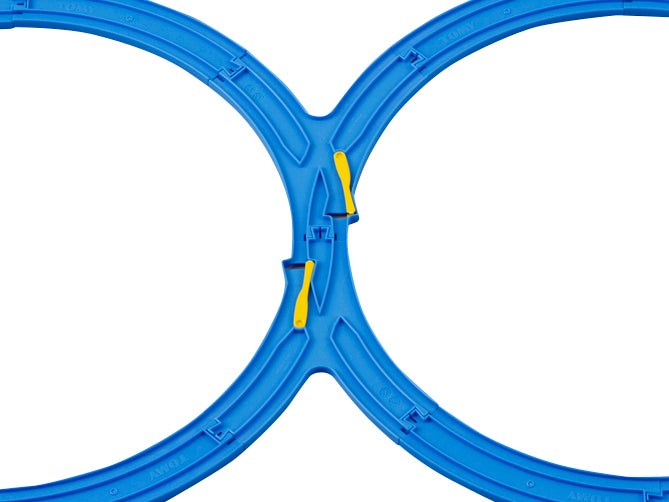 まず8の字ポイントレールをつなげよう。このとき、ポイントの切り替え部分が右か左のどちらかに偏らないよう、対象的に配置するのがコツだよ。