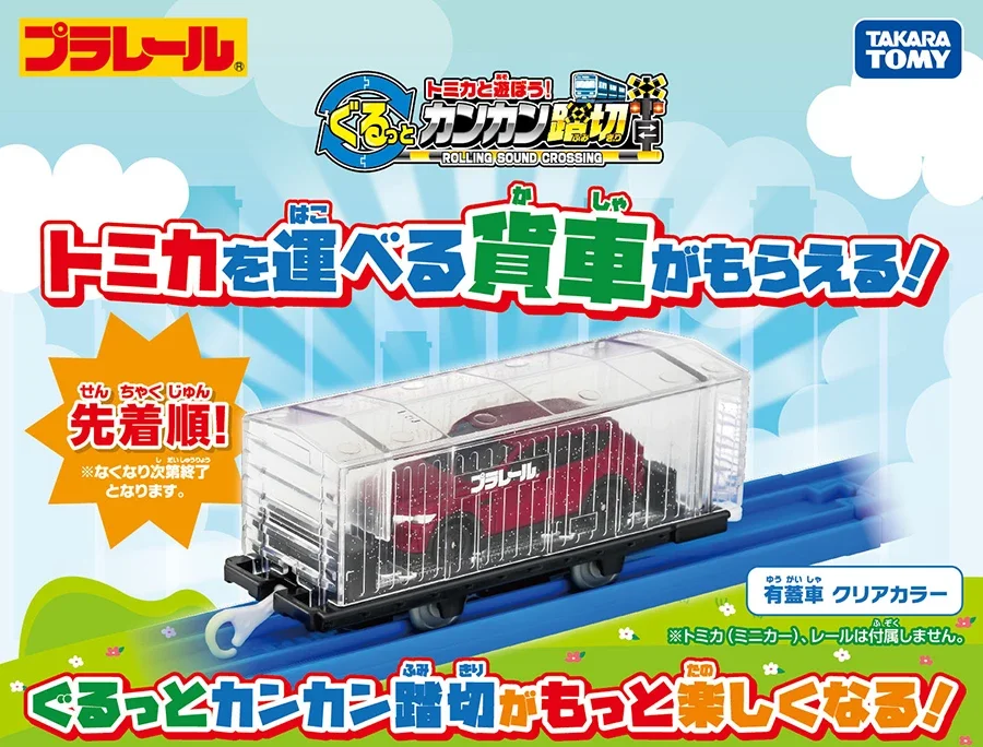 「トミカと遊ぼう!ぐるっとカンカン踏切」か、「レバーでアクション&サウンド!ビッグステーション」をお買い上げいただいたお客様に、トミカを載せて遊べる貨車を1台プレゼント!