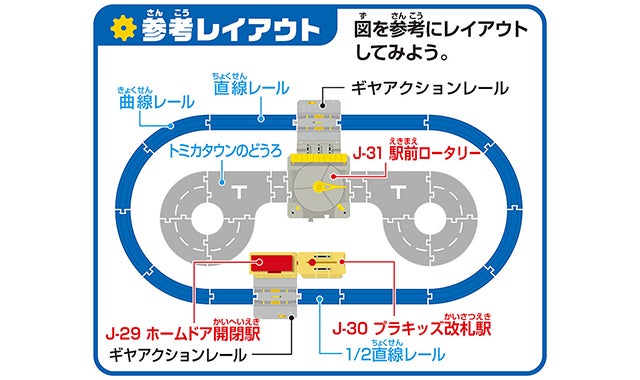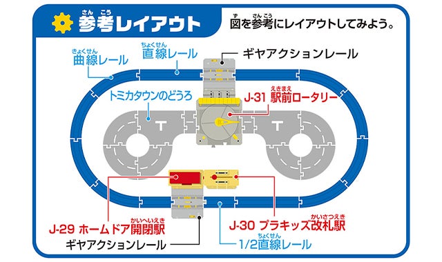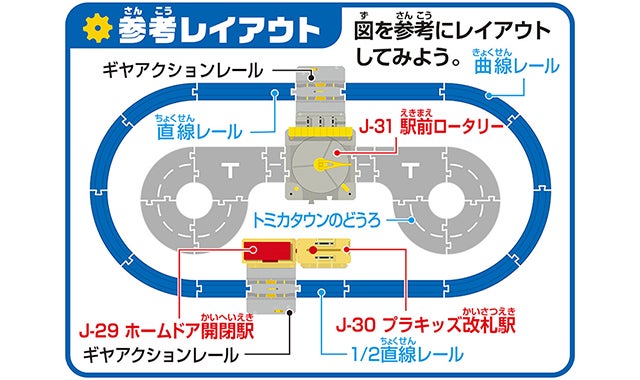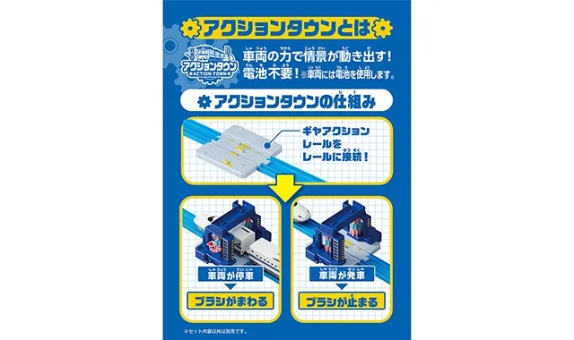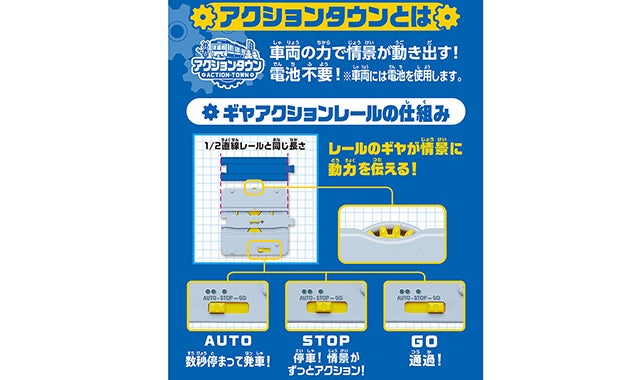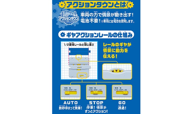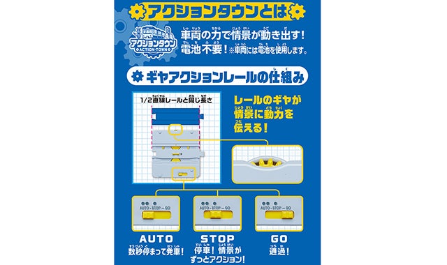 付属のギヤアクションレールは1/2直線レールサイズでレイアウトも組みやすい!キミだけの動き出す街を作ろう!
