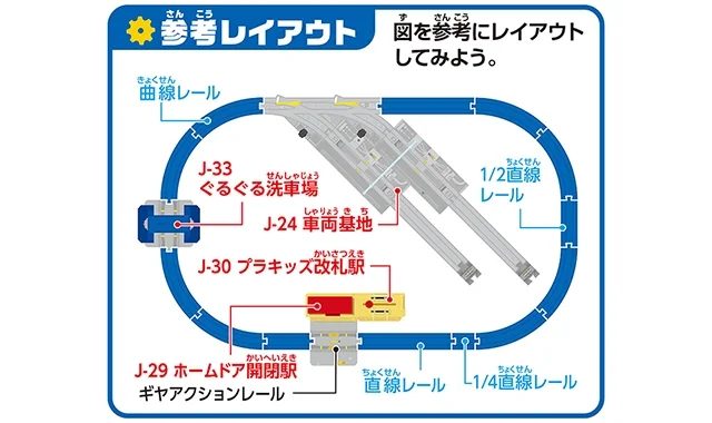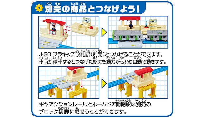 ■別売の「J-30 アクションタウン プラキッズ改札駅」とつなげることができ、車両が停車すると2つのアクションを一緒に遊べます。