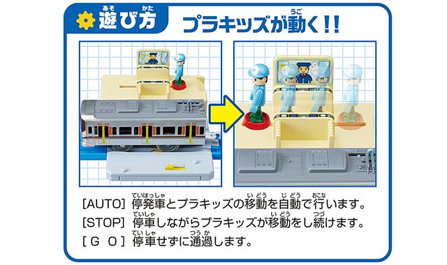 車両が駅に到着すると自動でプラキッズが動いて改札を通過!
