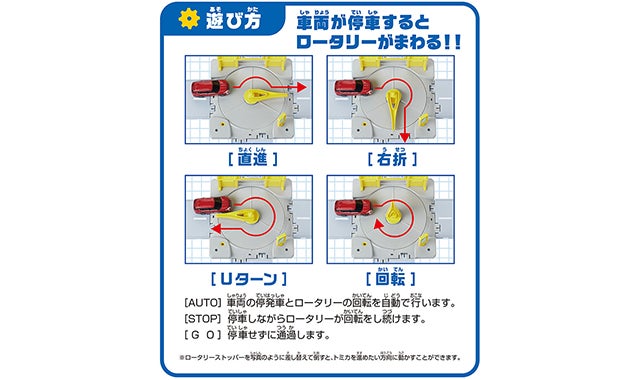 ■トミカを載せて遊ぶ場合、ロータリーストッパーの向きを変えるとトミカの進行方向を変えて遊ぶことができます。