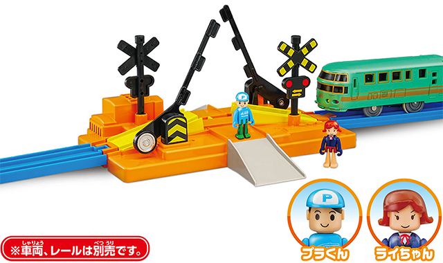 しゃ断機がおり音がなります。プラキッズ3体付き。
