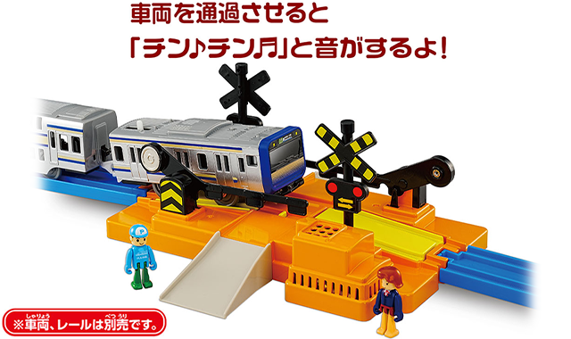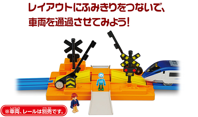 ・プラレール車両が通過すると遮断かんが降りるリアルな踏切!