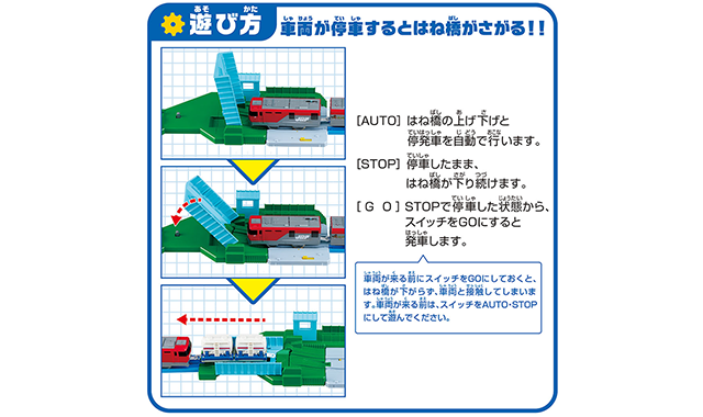 STOPでは停車したままはね橋がさがり、その後GOにすると車両が発車しはね橋も自動であがる手動操作ができます。