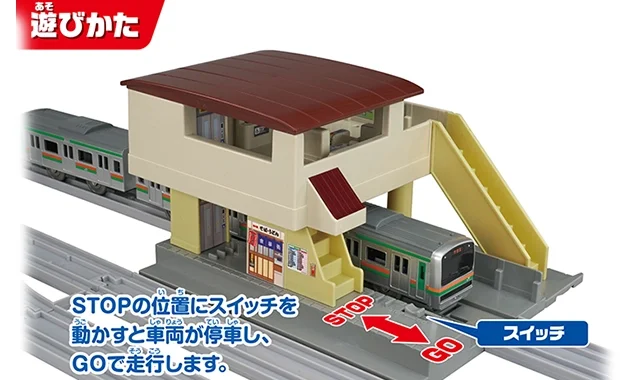 ■橋上駅舎のホームにはGO、STOPのスイッチがついており、停発車遊びが楽しめます。