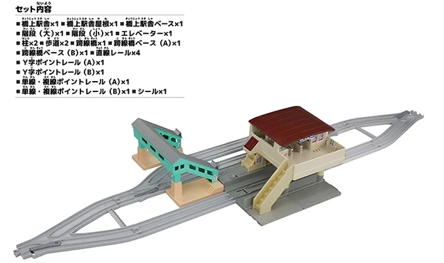 橋上駅舎と跨線橋、直線レール、Y字ポイントレール、単線・複線ポイントレールのキットです。