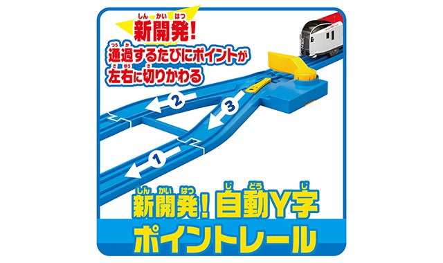 自動Y字ポイントレールは、車両が通過するたびにポイントが切りかわり自動で左右交互へ進路を変えることができます。