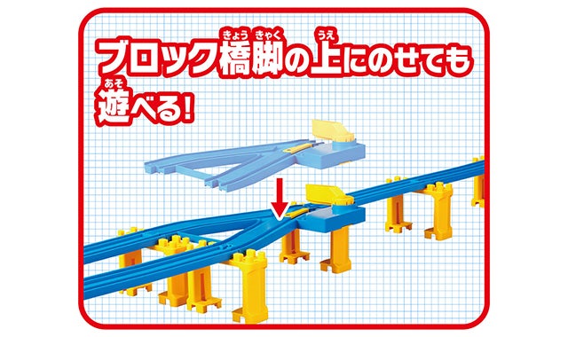 ■自動Y字ポイントレールはブロック橋脚の上にのせて遊ぶことができます。