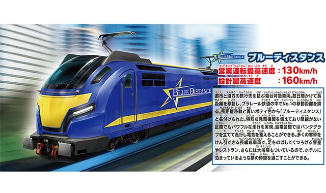 プラレール鉄道初の4両編成新車両「ブルーディスタンス」や、車両の力で自動でアクションする新情景シリーズ「アクションタウン」も入っている!