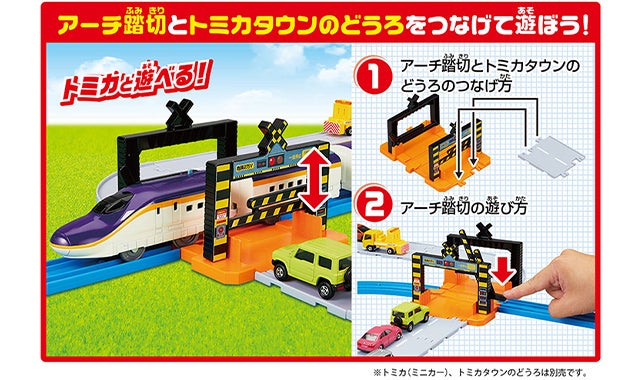 E8系は在来線区間も走行するためトミカと遊べるアーチ踏切で実際のシーンを再現して遊べます。
