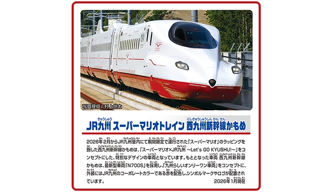 2025年11月からJR九州管内にて期間限定で行われる「スーパーマリオ✕JR九州 〜Let’s GO KYUSHU!〜」キャンペーンで、スーパーマリオの特別デザインを施された西九州新幹線かもめが、実車と同じ6両編成にプラキッズが1体付属してプラレールに登場です。