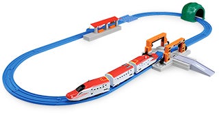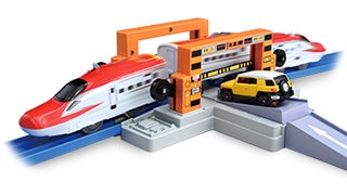 2013年3月に運行を開始した最新の新幹線「E6系スーパーこまち」がプラレールのセットに登場!車両は実車同様にE5系新幹線と連結した編成が実現できます。