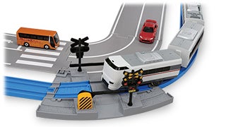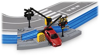 曲線部分で使用可能な踏切です。車両が通過すると遮断器がさがります。
