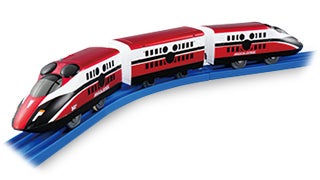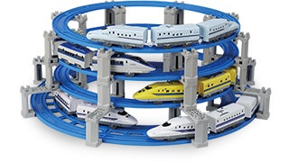 ぐるっと周回して坂を上るループや直線の長い坂道が特徴的なレールセットです。