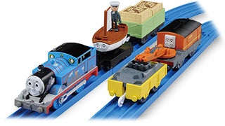 トーマスは、映画の中で活躍したどろをかぶったバージョンです。スキフの作中の茶色の姿で登場。スキフの上には船乗りジョン(プラキッズ)を経たせることができます。マリオンやダイナマイト貨車と一緒に、映画を再現して遊べます。