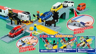 ボタンプッシュすることで、踏切を下ろし、トミカを止めたり、発進させたりすることができます。プラレールの通過に合わせて、トミカを発車させて遊べます。