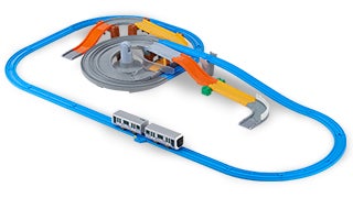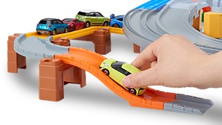 トミカとプラレールがループ橋をぐんぐん上がって、登りきったらループを一気にくだります。てころがしの競争をして遊ぶこともできます。