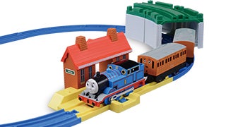 トーマス(動力車)とアニー&クララベル(貨車)、マロン駅とレンガトンネル2個にレールがついたトーマスの世界観が楽しめるオールインワンセットです。トーマスやアニー、クララベルの表情が新しくなりました!