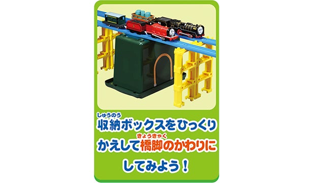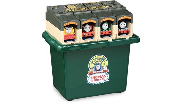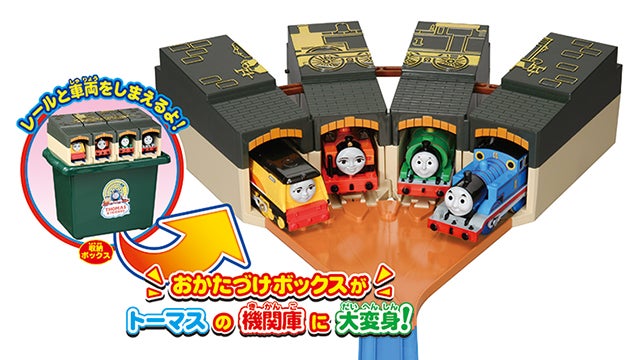 たたむと、機関庫に先頭車4両を収納でき、収納ボックス(バケツ部分)にレールや車両を収納できます。広げるとトーマスのお話でおなじみの機関庫に早変わり。