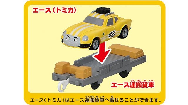 トーマス(動力車)とニア(動力車)と一緒にエース(トミカ)を専用貨車に搭載して映画のシーンを再現しよう!