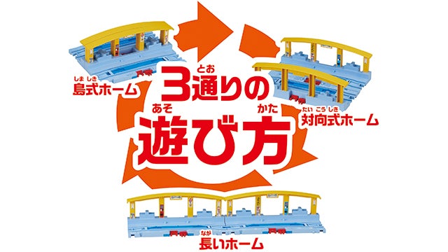 島式ホーム、対向式ホーム、長いホームの3つのパターンに組み替えられるストップ機能付きの駅です。島式ホームと対向式ホームでは2線の車両を同時にコントロールできます。