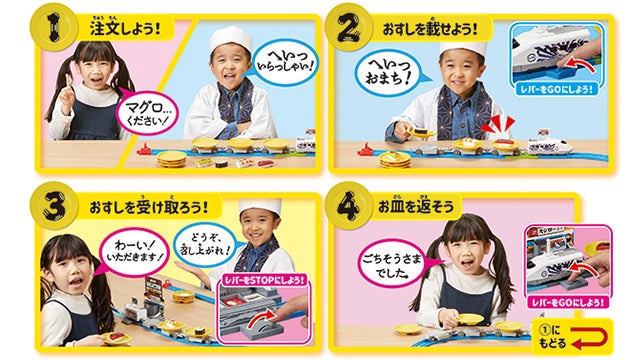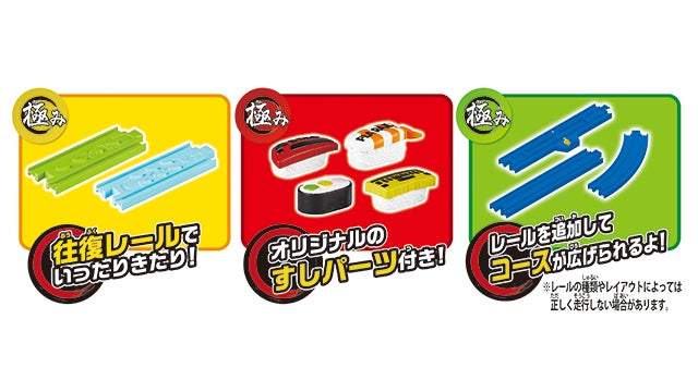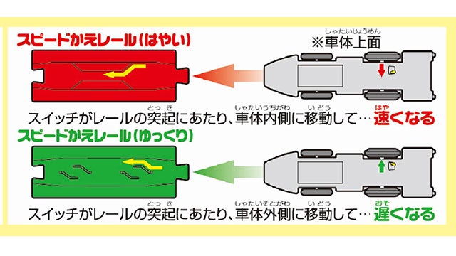 付属の「スピードかえレール」(はやい・ゆっくり)を組み込めば好きなところでスピードの変化が楽しめます。浮上をイメージして車輪は半透明になっています。