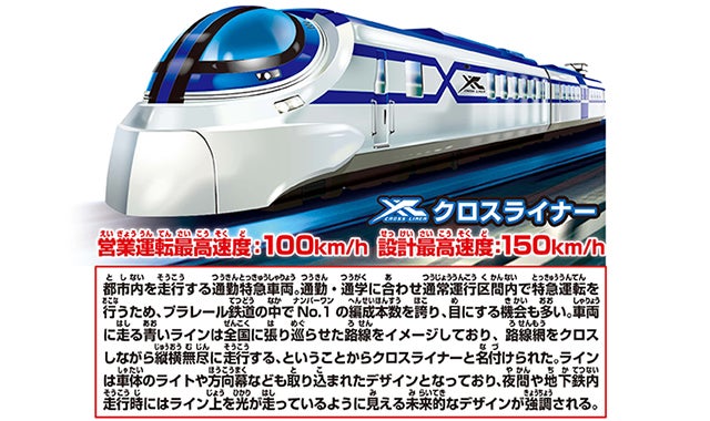 新登場のオリジナル車両「クロスライナー」には駅と連動してお客さんの乗降遊びが楽しめる仕掛け付きです。パーツは全24種類6種類以上のレイアウトを組むことができます。