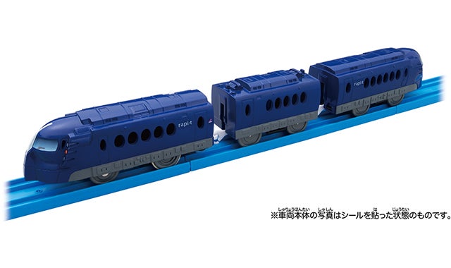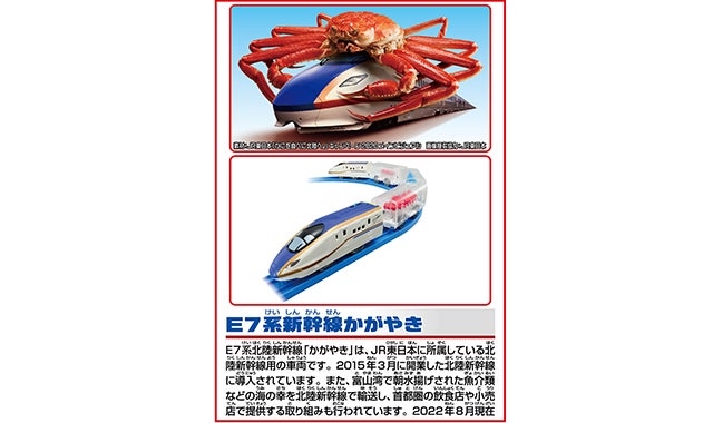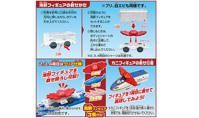 カニ・ブリ・白エビの3つの海鮮フィギュアが付属し、クリア仕様の中間車に載せ降ろし遊びができます。