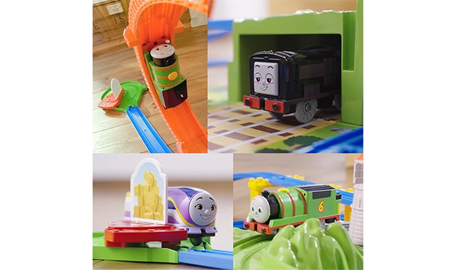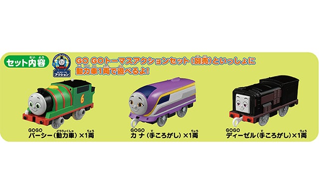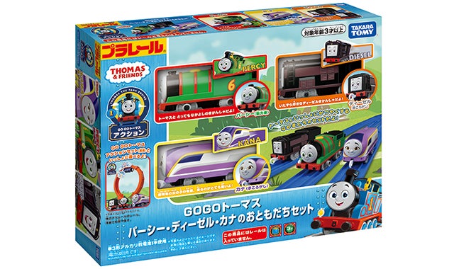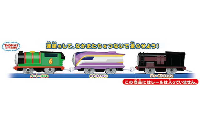 ・動力車のパーシーにカナとディーゼルを連結し、プラレールのレールを走行して遊べます。