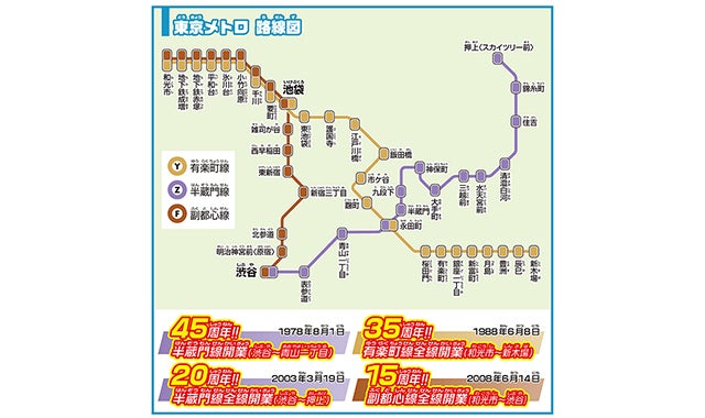半蔵門線は開業45周年/全線開業20周年、有楽町線は全線開業35周年、副都心線は全線開業15周年です。