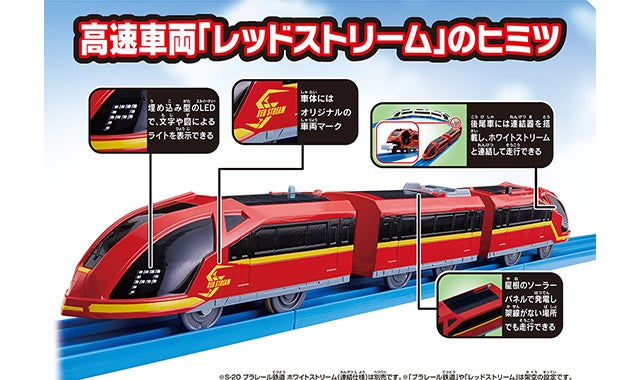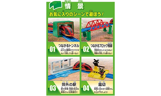 人気の「連結」遊びができるオリジナル新車両「レッドストリーム」や、新開発の「つながるトンネル」「つながるブロック橋脚」「橋直線レール」も入っている!
