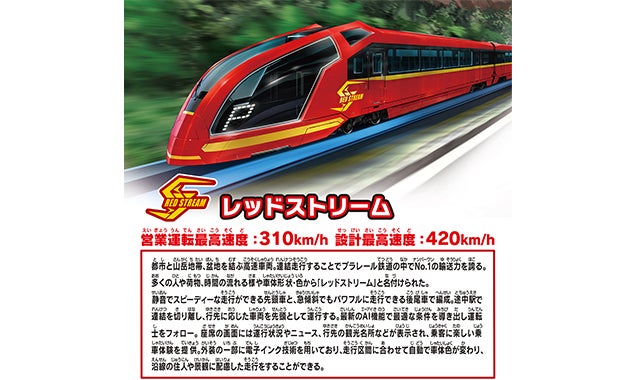 プラレール鉄道の中でNo.1の輸送力を誇り、途中駅で連結・切り離しを行い都市と山岳地帯、盆地を結ぶ高速車両です。