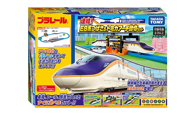 E8系をより楽しめるトミカアーチ踏切や、S字レールの限定カラーも付いたオールインワンセット!