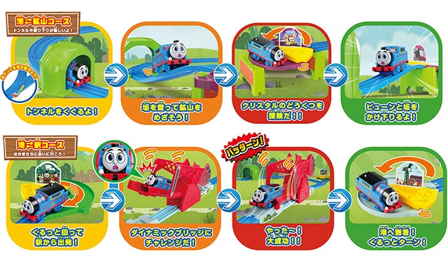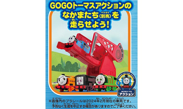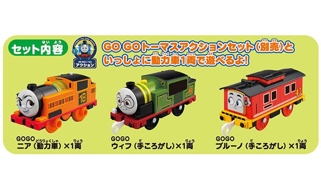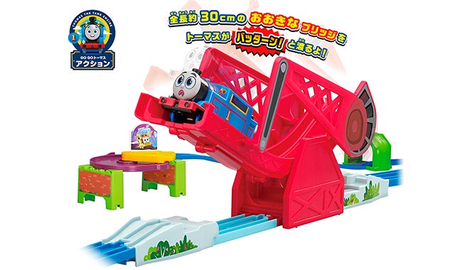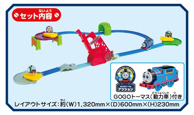 ・動力車1両で「GOGOトーマス わたってバッターン!ダイナミックブリッジ」など、GOGOトーマスアクションセット(別売)のコースを走行させることができます。
