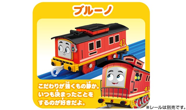 ・動力車のニアにブルーノとウィフを連結し、プラレールのレールを走行して遊べます。
