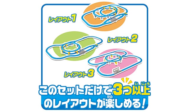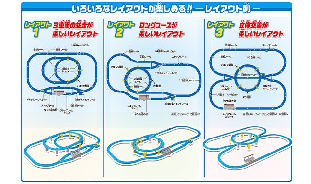 ■3編成の並走レイアウトや、ロングコースレイアウト、立体交差レイアウトなどこのキットだけで3つ以上のレイアウトが楽しめます。