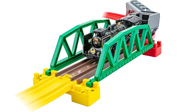 ■自動Y字ポイントレールはブロック橋脚の上にのせて遊ぶことができます。