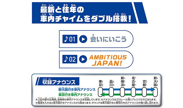 最新の車内チャイム「会いにいこう」と、往年の車内チャイム「AMBITIOUS JAPAN!」の両方を楽しむことができます。