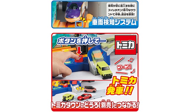 ■駅前ロータリーではトミカと遊べ、スロープではボタンを押すとトミカが発車しサウンドが連動します。