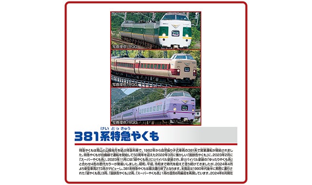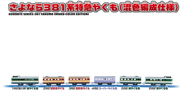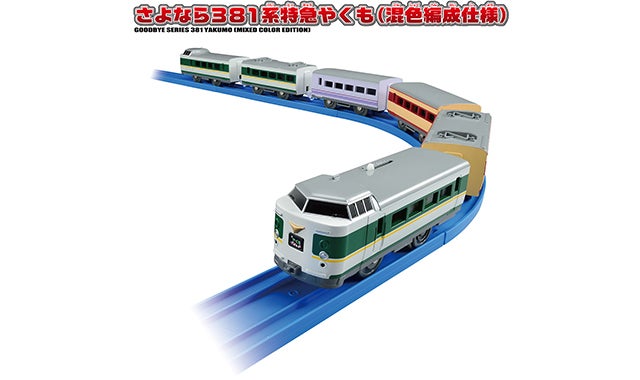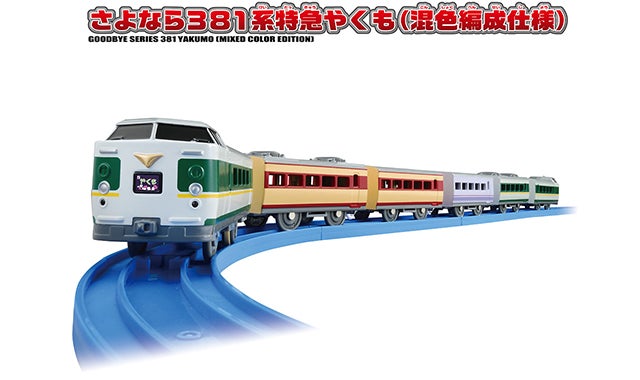 1982年の営業運転開始から昭和、平成、令和まで時代を超えて走り続け、2024年6月に定期運用が終了した381系特急やくもから、1990年代後半に実際に運行された「緑やくも色」「国鉄色やくも」「スーパーやくも色」の混色6両編成がプラレールに登場です。