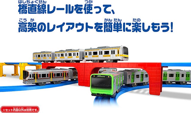 橋脚と直線レールが一体になっているので、高架のレイアウトを簡単に作ることができます。