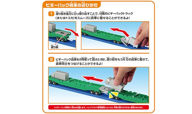 付属のピギーバックトラックは貨車に載せて遊ぶことができ、別売のトミカ(ミニカー)を載せて遊ぶこともできます。
