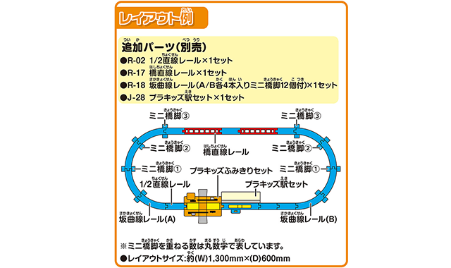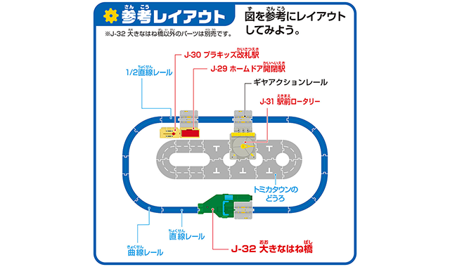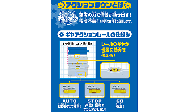 付属のギヤアクションレールは1/2直線レールサイズでレイアウトも組みやすい!キミだけの動き出す街を作ろう!