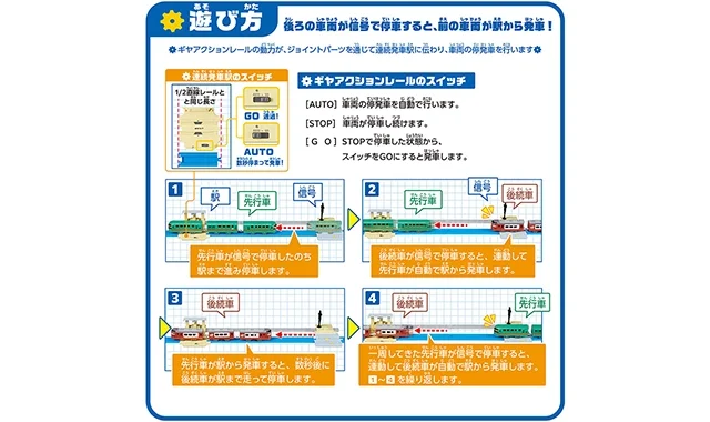 4:その後一周してきた先行車が信号で停車すると、連動して後続車が自動で駅から発車し、1~4を繰り返し遊べます。