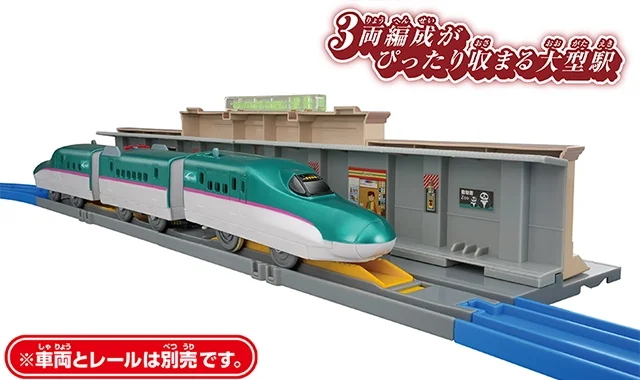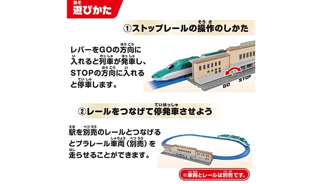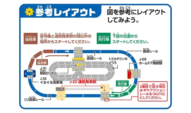 ※連続発車駅を機能させるために2編成のプラレール車両が必要になります。(車両は各3両以下で遊んでください。)