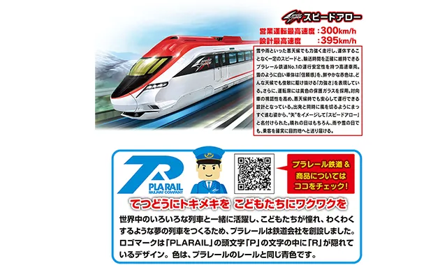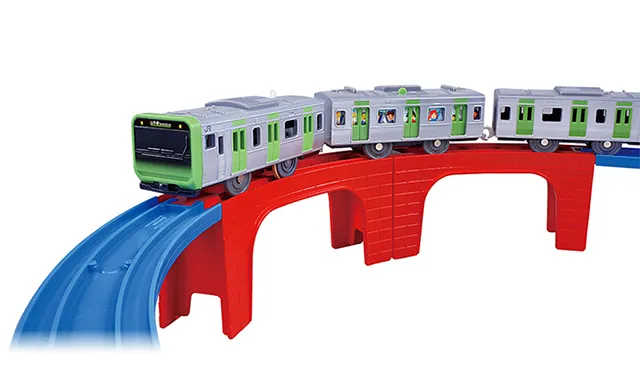 オリジナル新車両「スピードアロー」や、高架が簡単に作れる「橋曲線レール」「PC橋脚」をはじめ、「駅」「踏切」「つり橋」「曲線ガーター橋」「トンネル」まで入った、すぐに遊べるオールインワンセットです。